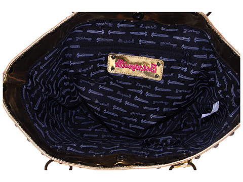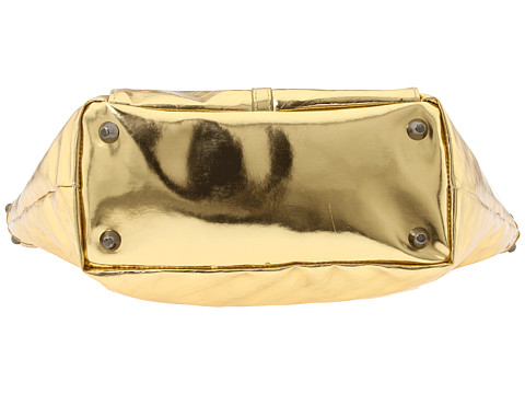 Shoulder bag made of synthetic patent or metallic leather with tonal stripe detailing.